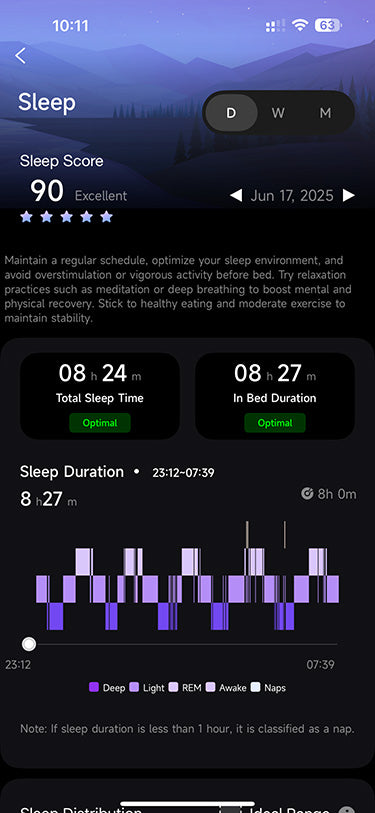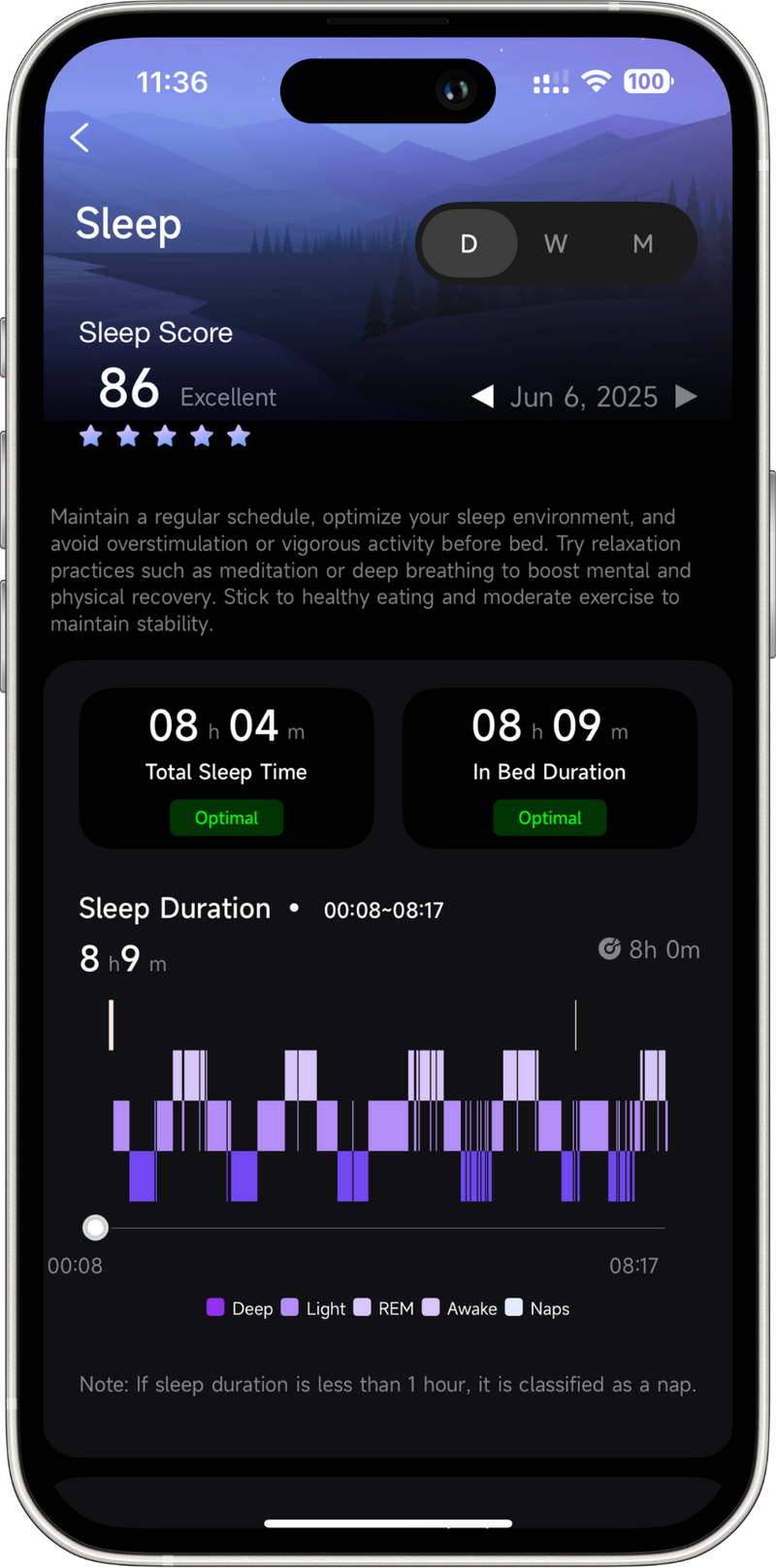 It gives you a clear picture of your overnight recovery, helping you understand how well your body restores itself. Each morning, you’ll wake up to a Sleep Score designed to guide smarter choices during the day.